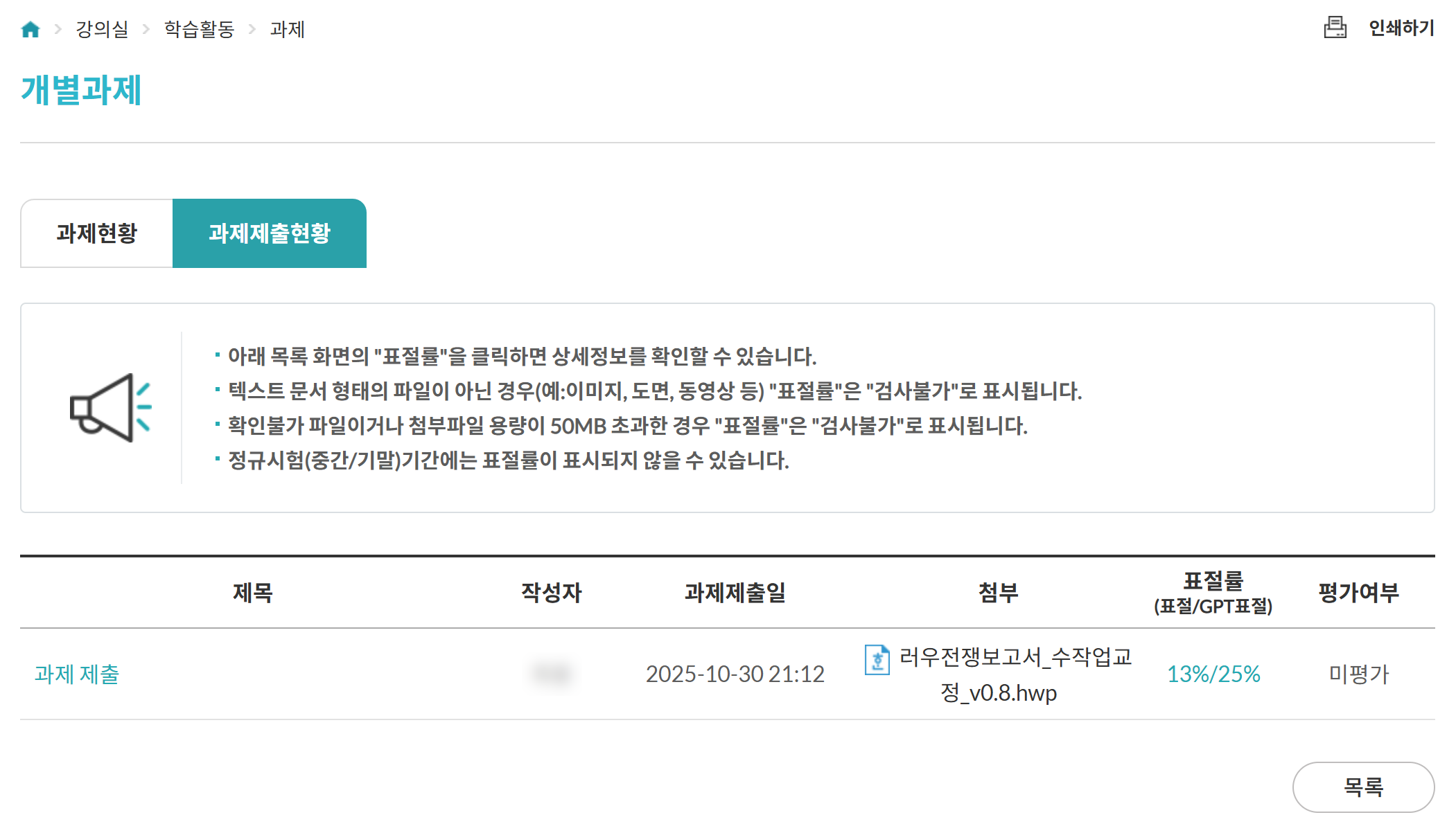 요즘 학교 시스템에 과제물을 제출하면 자동으로 표절률이 계산되어 나오는데, '표절'과 'GPT표절'이 각각 비율로 매겨진다. 학교 전체 지침이 있는지는 모르겠지만, 어떤 과목에서 표절률이 30% 이상이면 점수를 안 준다고 했던가 감점한다고 했던가 그랬던 것 같다. 그래서 일단 거기에 맞추려고 한다.